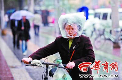 西安丰镐西路,一老人将塑料袋包在头上挡雨 本报记者 张杰摄
